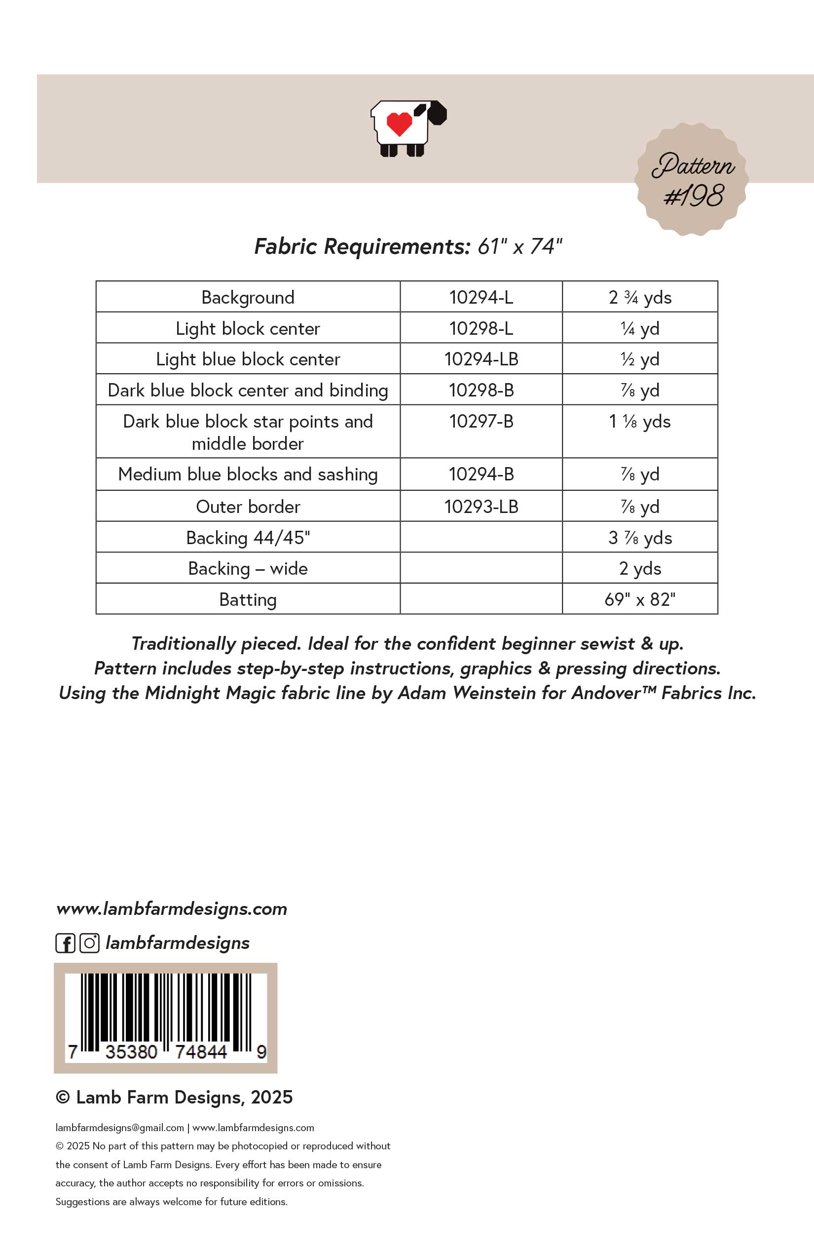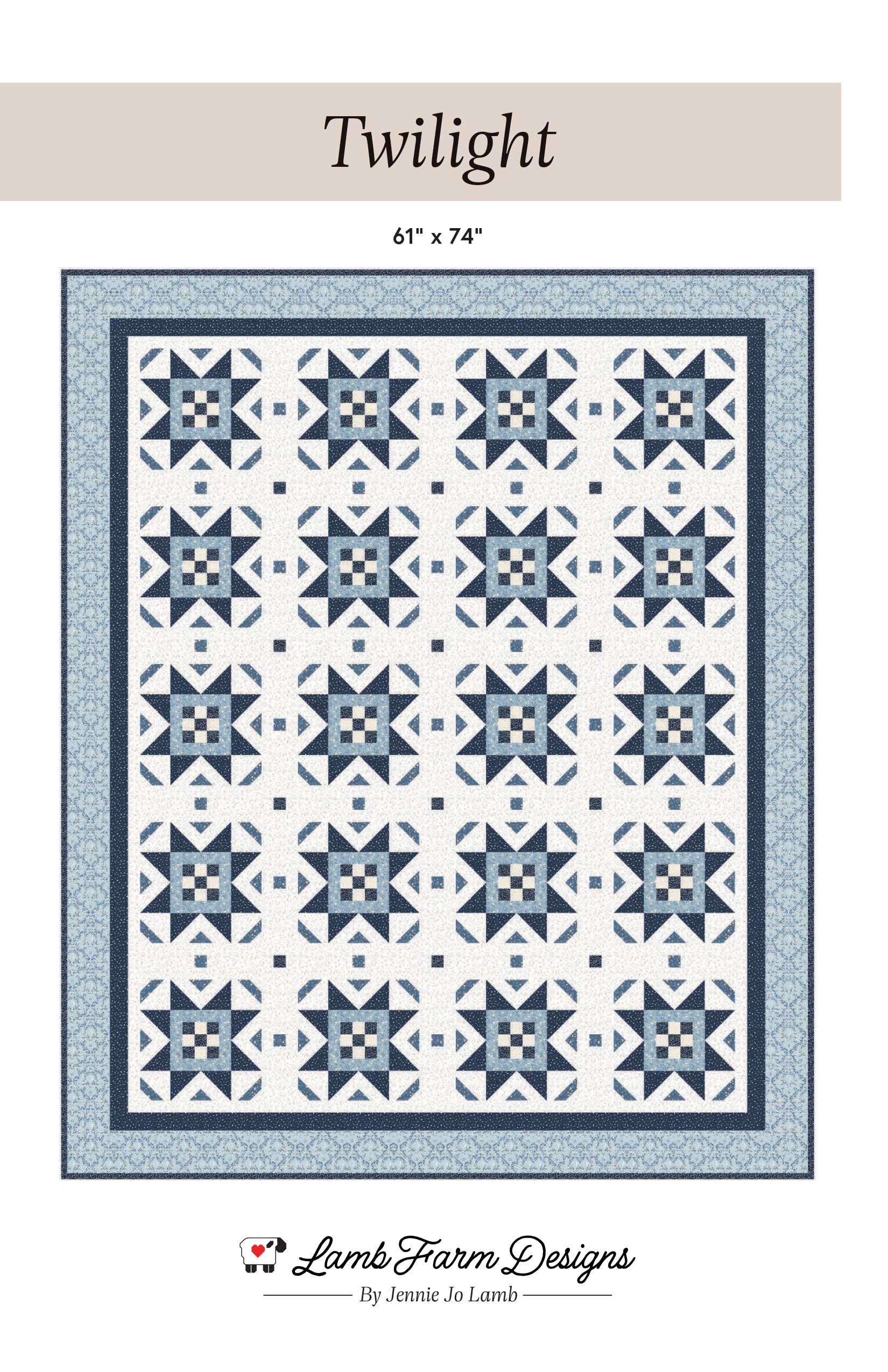 Twilight by Lamb Farm Designs is a confident beginner-friendly quilt pattern that features a traditional star design with charming 9-patch centers. This generous lap quilt measures 61" x 74" and is made with traditional piecing methods, showcasing calming blues from the Midnight Magic collection by Adam Weinstein for Andover Fabrics Inc. With its classic style and soothing color palette, Twilight is a relaxing and rewarding project that creates a timeless quilt perfect for cozy evenings.